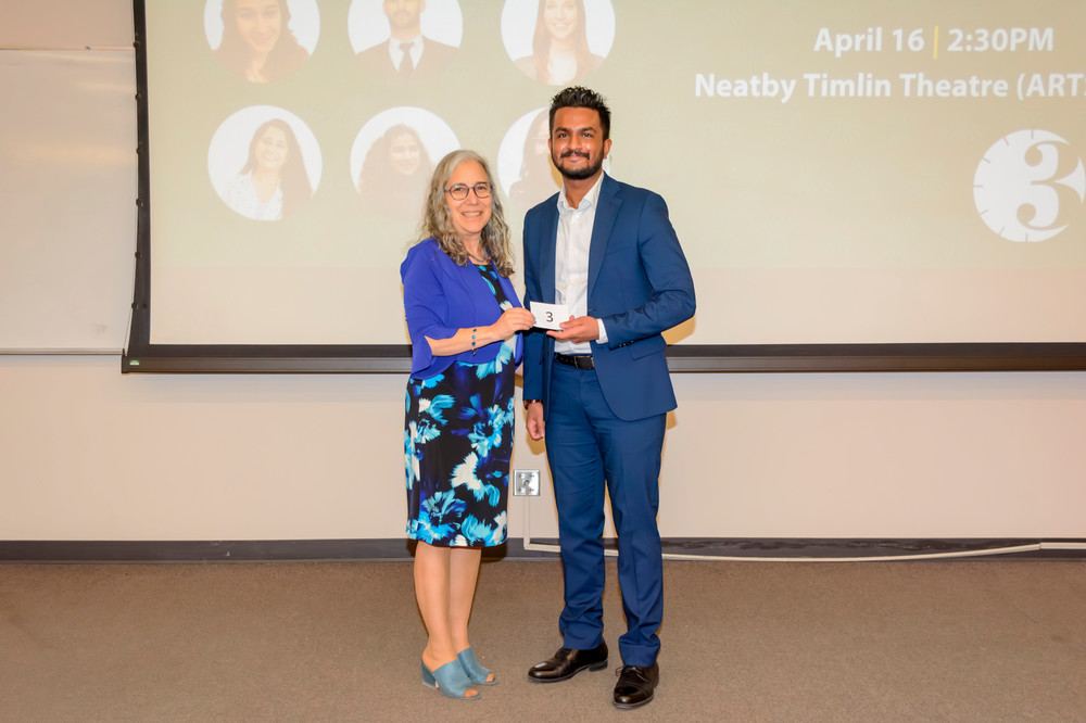 The 3MT competition was a fantastic opportunity to showcase my research in a unique and challenging format. Condensing years of work into a three-minute presentation was no easy task, but it taught me how to communicate my ideas clearly and effectively. The support and camaraderie among the participants were amazing, and I learned so much from watching others present their work. Winning the People's Choice Award was a highlight of my academic journey, and I am grateful for the experience. The 3MT is a must for any graduate student.
